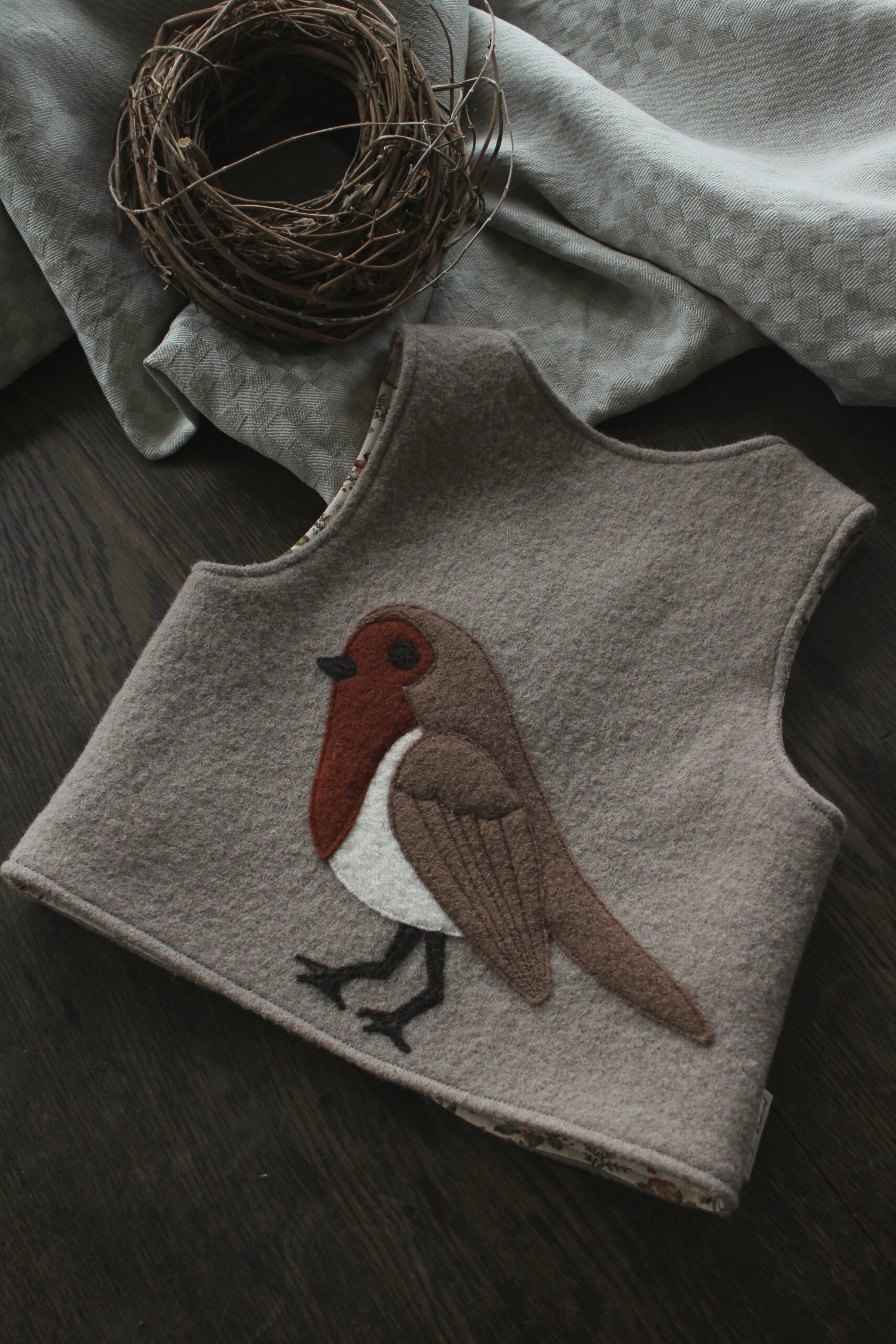 Eine aufwendige Rotkehlchen Applikation ist das Highlight dieser Walkweste aus 100% Schurwolle