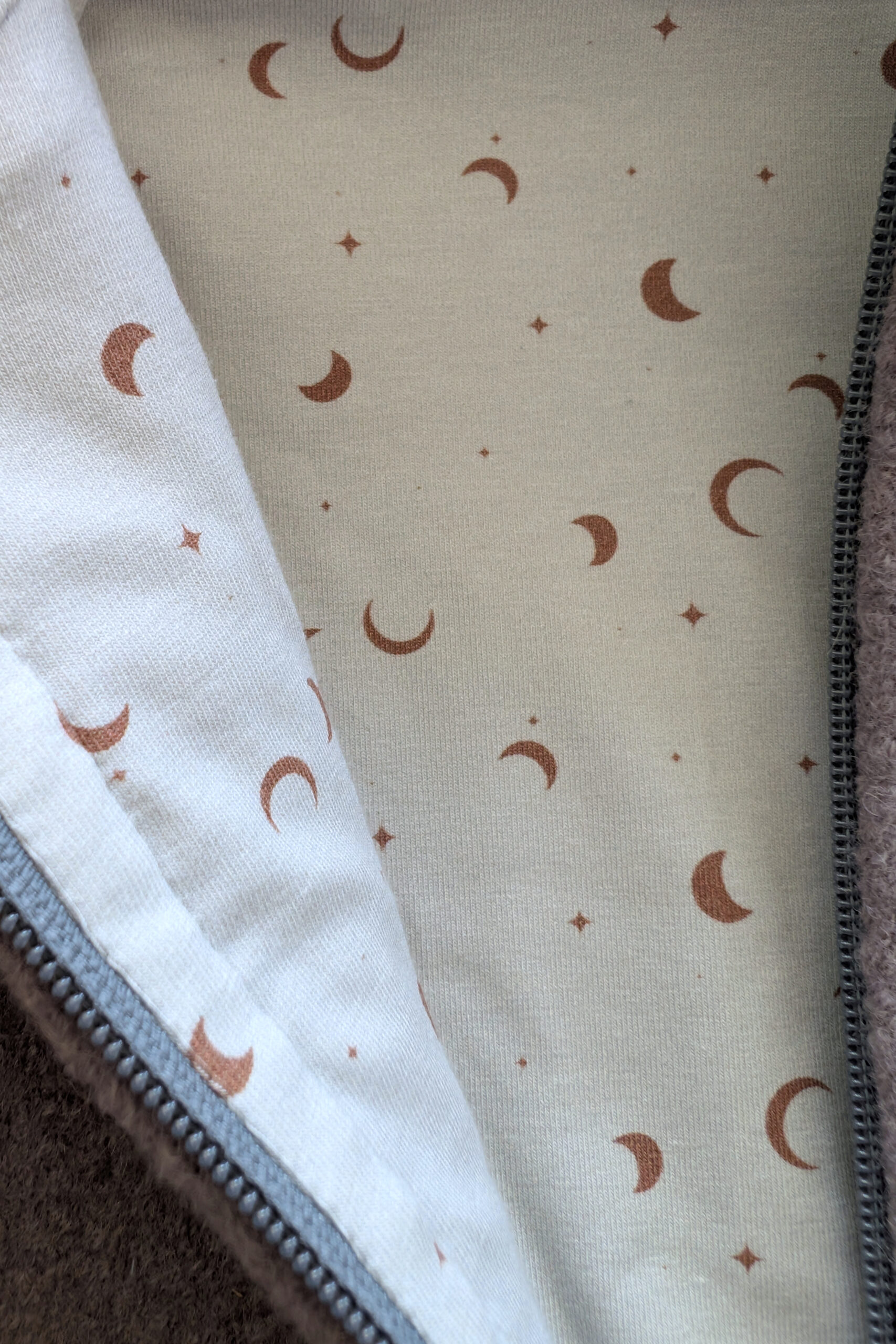 Vorne mit Reißverschluss zu schließen und innen komplett mit weichem Baumwoll-Jersey gefüttert. Die Kapuze ist auf Wunsch mit kuscheligem kurzem Baumwollplüsch (kbA) gefüttert.